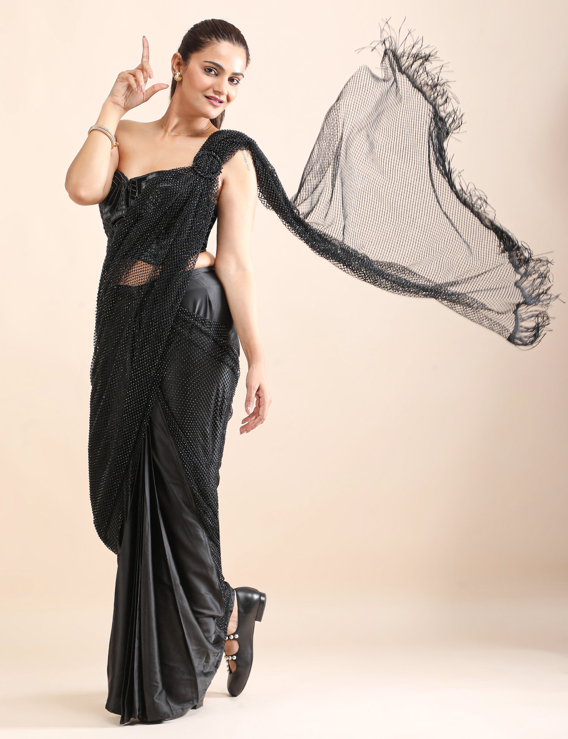 ✔️ Sheer mesh pallu with fringe tassels for graceful drama