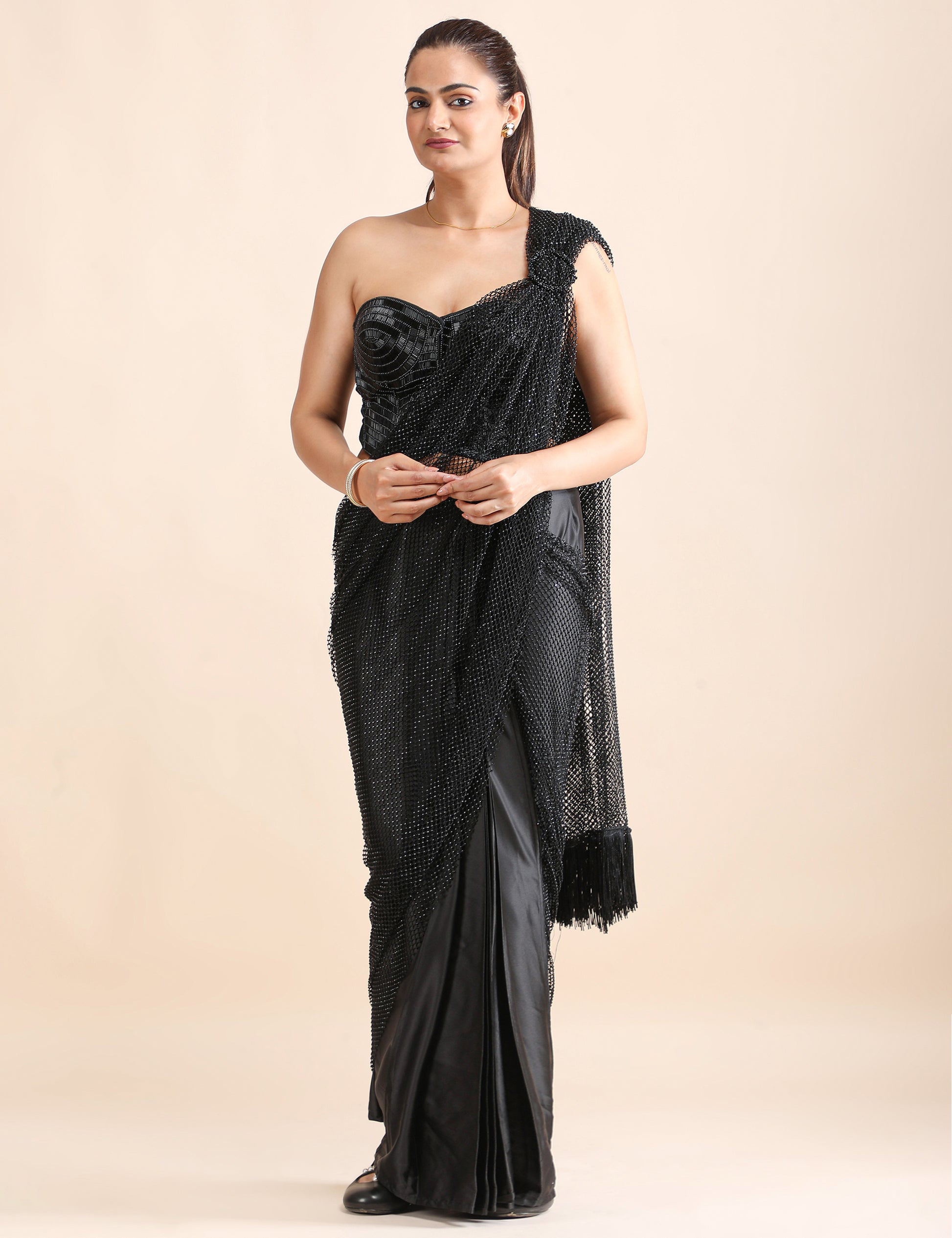 Step into bold elegance with our Noir Siren Corset Pre-Draped Saree — a stunning fusion of sultry sophistication and effortless glam. Crafted in rich black tones, this statement saree features a hand-embellished beaded corset blouse that hugs your curves, paired with a dramatic mesh pallu adorned with delicate tassels that flows like poetry in motion.
