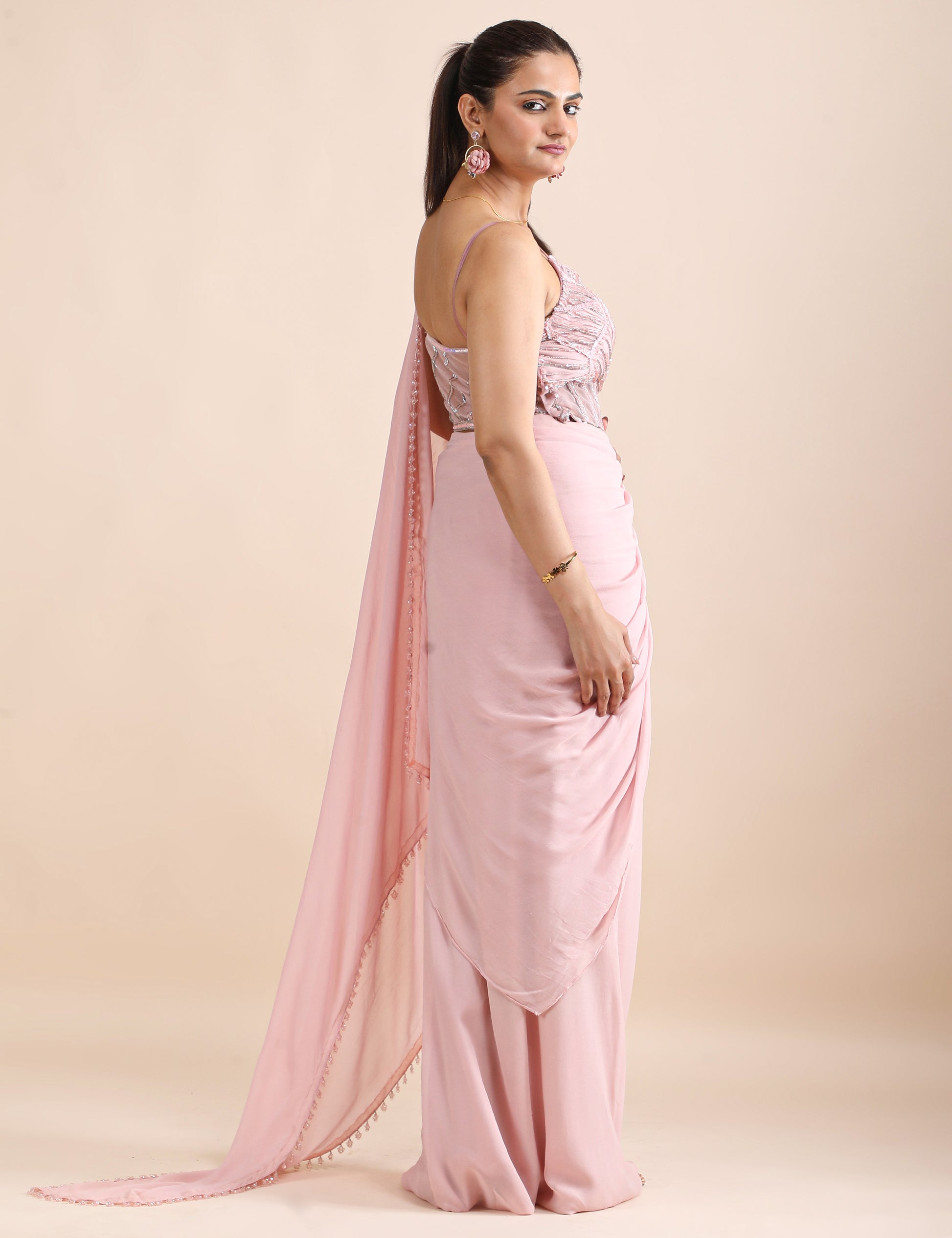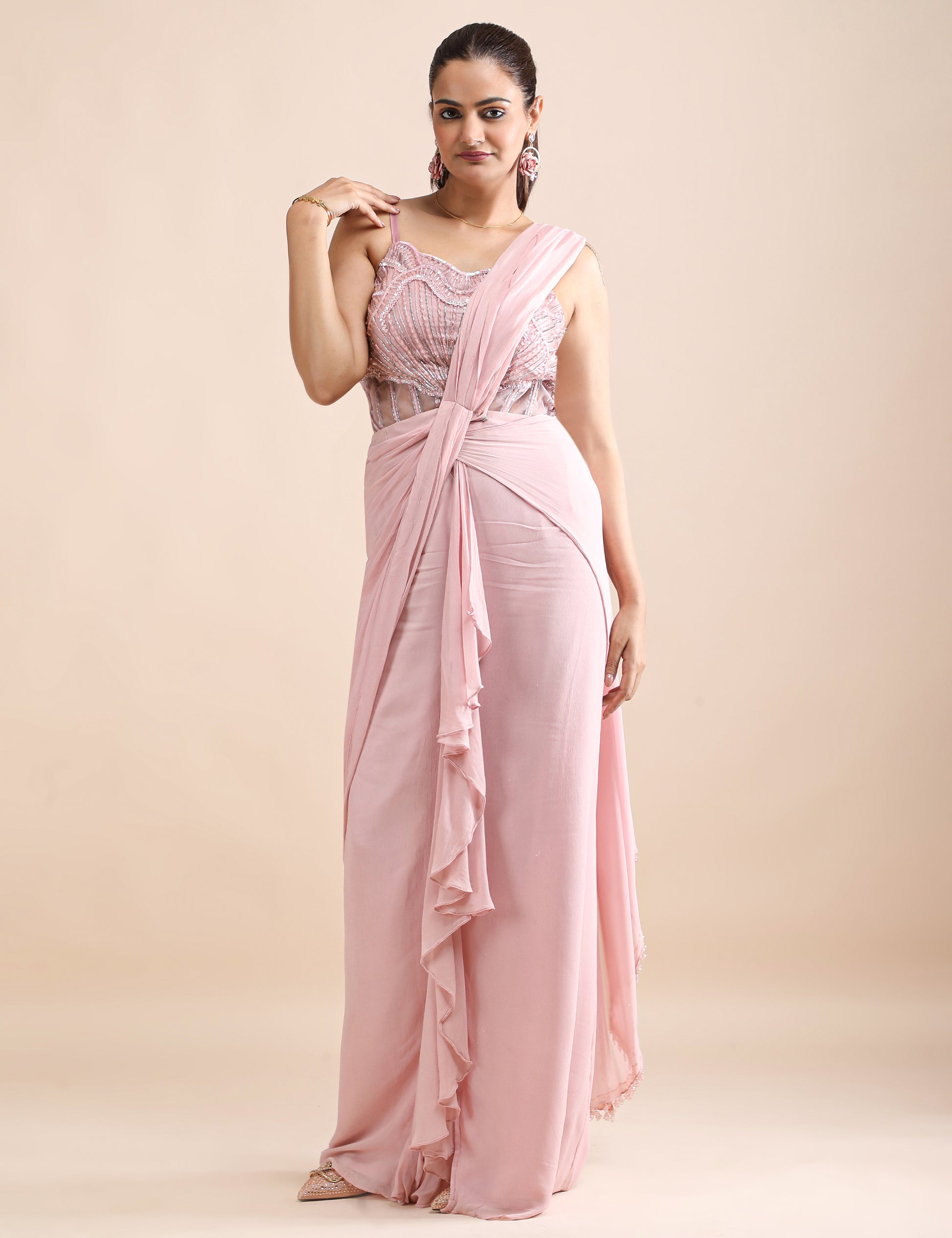 Rosé Whisper Pre-Draped Saree with Embellished Corset Blouse
